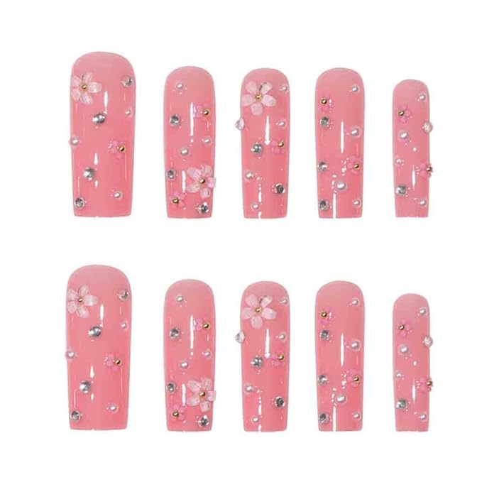 Pink Press on Nails Long 3D Flower Fake Nails Square Bling Glossy Rhinestone False Nail Tips Artificial Nails Finger Manicure for Women and Girls,24pcs