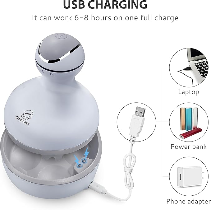 - {Rechargeable and Portable} Comfier hair scalp massager for hair growth is designed to be portable and rechargeable, with a lithium-ion battery that eliminates the need for a plug during use.Comfier rechargeable head massager comes with a charging base and a USB cable and can last for several hours on a single charge.With its compact, cordless design, you can easily take it with you wherever you go and enjoy a relaxing scalp massage on-the-go.