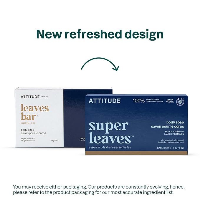ATTITUDE Body Soap Bar, Natural Origin,Protects and Softens Dry Skin, Coconut & Olive Oils, For Men and Women, EWG verified & Vegan, Sage & Rosemary, 4 Oz