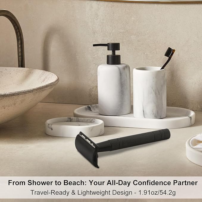 - Travel-Ready & Lightweight Design: Perfect for on-the-go grooming! Weighing 30% less than standard metal safety razors, this compact safety razor fits perfectly into any toiletry bag or suitcase. Making it ideal for travelers and eco-conscious adventurers. Perfect for gifting to family or friends who value zero-waste lifestyles