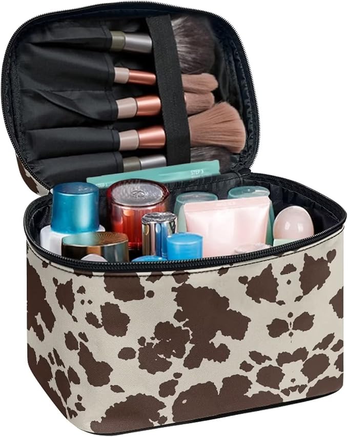 Cute Brown Cow Cowhide Design Travel Makeup Bags for Women and Portable Tote Cosmetic Case with Carry Handle Toiletry Accessories Storage Organizer Bags