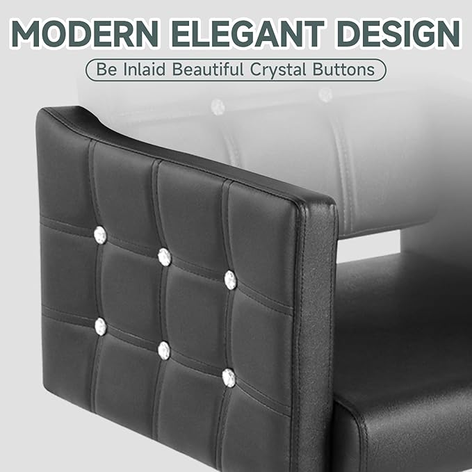 - MODERN AND ELEGANT: Hicomony hair chair is covered with coloured PVC artificial leather, which is skin friendly and breathable. Both sides and backrest are tufted beautiful crystal buttons. Making the black salon chair be more elegant and decorative matching with decoration in any beauty salon, spa or barbershop.