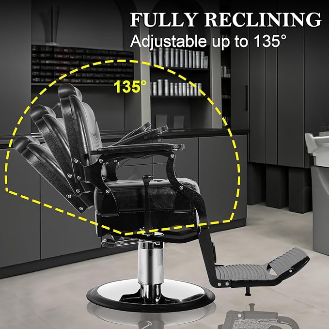 - 【Height Adjustable】: This highly adjustable barber chair can swivel 360 degrees, the backrest can be tilted up to 135 degrees, height adjustable up and down 5.5 inches. The seat is wide and comfortable. It can meet the various needs of customers