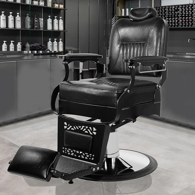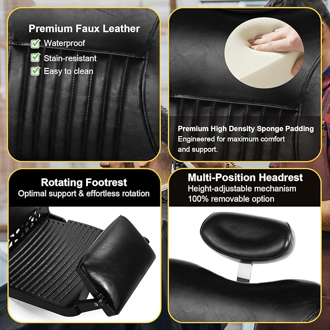 - 【Quality Materials】: The seat of the barber chairs for barbershop is covered with PVC artificial leather, which is skin-friendly and breathable, wear-resistant, and easy to clean. In addition, the seat is filled with high-density memory foam, soft and elastic. The galvanized surface is rust-resistant. It is also equipped with a steel footrest