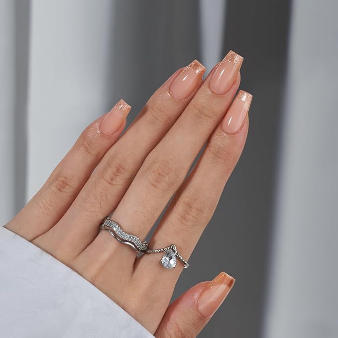 BTArtbox Press on Nails Coffin - Gold Rose French Tips Press On Nails Short for Women, Cat Eye Nail Tips, Glitter Fake Nails with Glue, Glue On Nails in 16 Sizes - 30 Nail Kit, Gold Dust