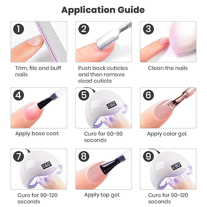 - SALON QUALITY HOME USED:Glitter nude gel nail polish is good choice for use in a professional nail salon or nail starter at home.You can design your own manicure at home to show your style. Remember the gel polish needs to be cured under nail lamp. Average for Nail Lamp 60-120 secs