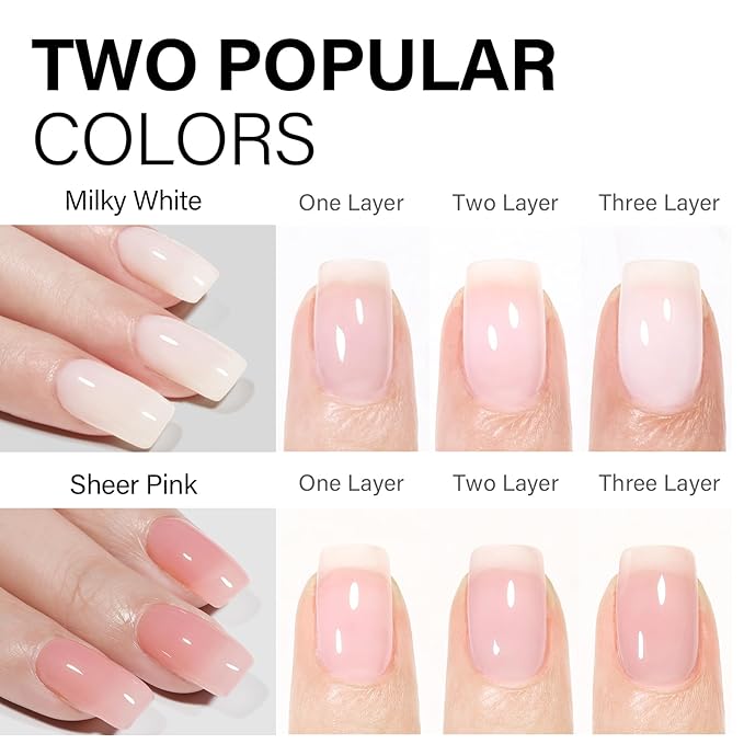 - ALL-MATCH COLORS: The gel nail tips kit includes two colors jelly gel polish: milky white and light pink, matching any outfit or occasion. Two colors can also be paired with each other to create your own nail style. The color depth depends on your nail base color and the number of layers you apply, the fewer layers the more sheer and the more layers the more vibrant. Adding the top coat will give your nails a shiny protective finish and prevent scratches from damaging your beautiful nails