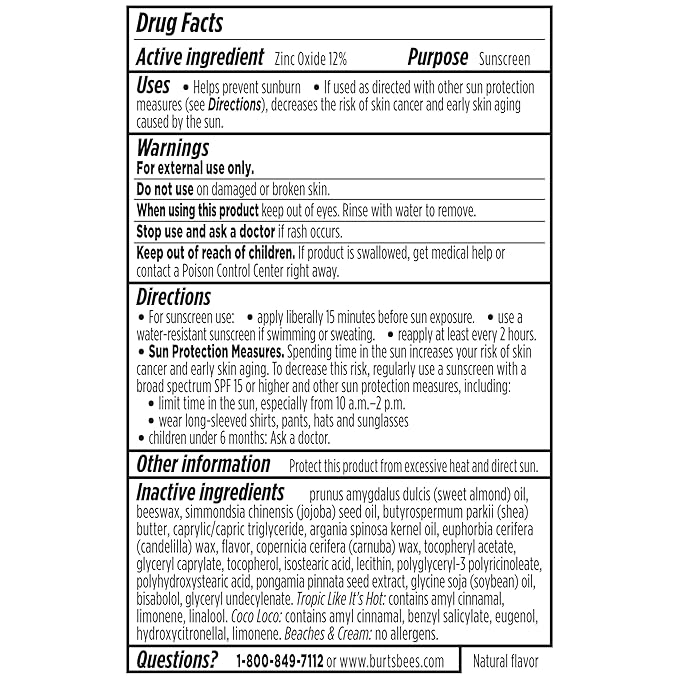 - NANO-FREE LIP BALM PACK: One package contains three 0.15 oz. lip balm tubes of Burt’s Bees Sun Care SPF 30 Lip Balm, including one tube each of Coco Loco, Beaches and Cream, and Tropic Like It's Hot