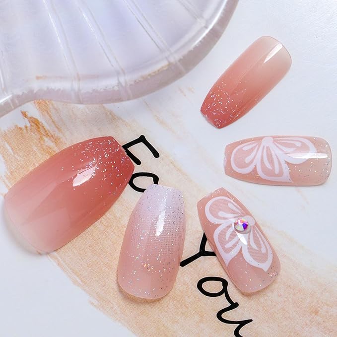 Pink Press on Nails Coffin Short Acrylic Nails Artificial False Nails with Glitter Butterfly Designs Full Cover Gradient Pink Fake Nails Short Ballerina Nails for Women