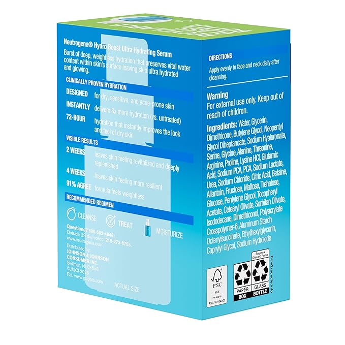 - 1-fluid ounce recyclable glass bottle of Neutrogena Hydro Boost Ultra Hydrating Serum contains hyaluronic acid to deliver a burst of deep, weightless hydration and reveal softer, glowing skin