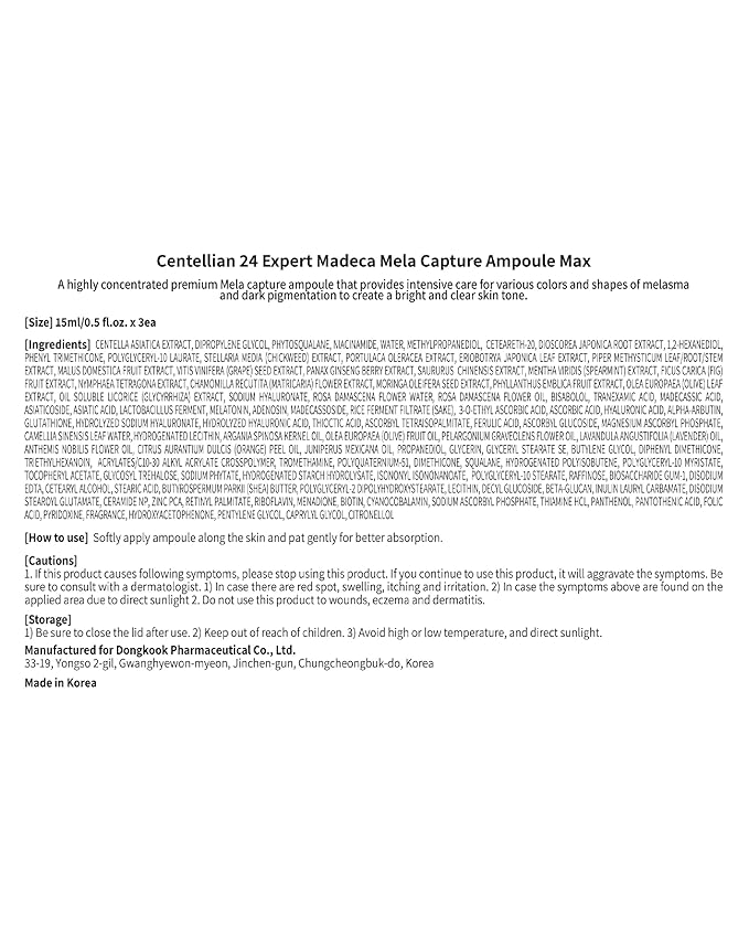 - CENTELLIAN 24 EXPERT MADECA CAPTURE AMPOULE MAX (Season 4, 15ml/0.5fl oz x 3 pcs) - Experience the power of this premium ampoule that effectively targets and manages multiple skin concerns. Formulated with a high concentration (10,000 ppm) of TECA (titrated extract of centella asiatica) and centella asiatica extract (568,000 ppm), it works to combat dark spots, reduce the appearance of wrinkles, and enhance skin elasticity.