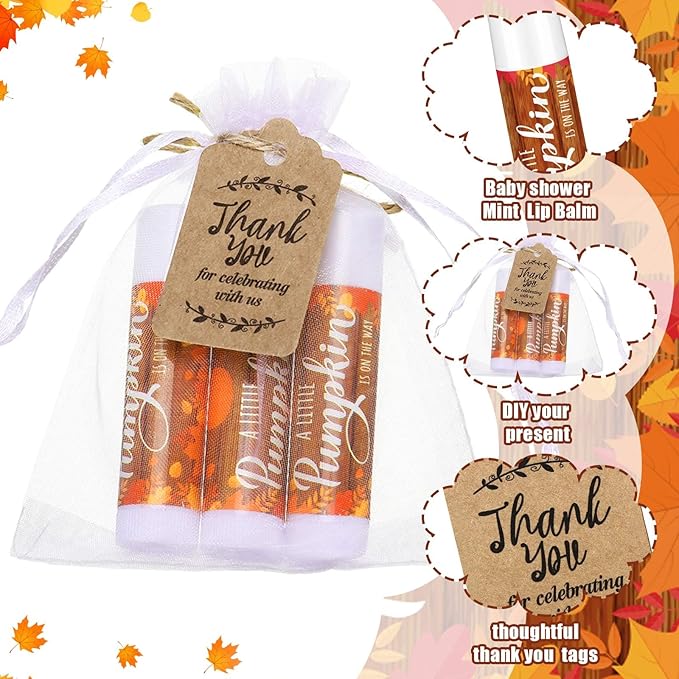 Demissle 50 Pcs Baby Shower Lip Balm Gift Set with 100 Pcs Organza Bags Baby Shower Party Favor for Guest Thank You Tag Rope Baby Shower Party Decoration Gender Reveal Souvenirs(Pumpkin)