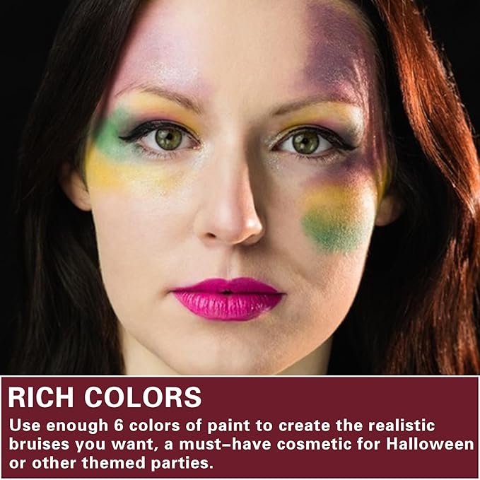 - 【6 Color Bruise Wheels Kit】The bruise wheels can be used for face, hand and body painting, and can be mixed and matched to get various bruise effects, especially for special effects makeup or Halloween makeup. 6 colors of paint give you realistic bruises.