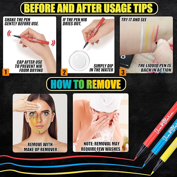 - SKIN SAFE MARKERS - You can use this face paint pens in every part of your face and body and match it with your outfit or costume. Embrace worry-free fun with our skin-sensitive formula. Skin paints ensure a comfortable experience, free from irritation, clogged pores, itching, or cracking. Suitable for all ages kids and adults. Enjoy every brushstroke knowing your skin's well-being is our priority.