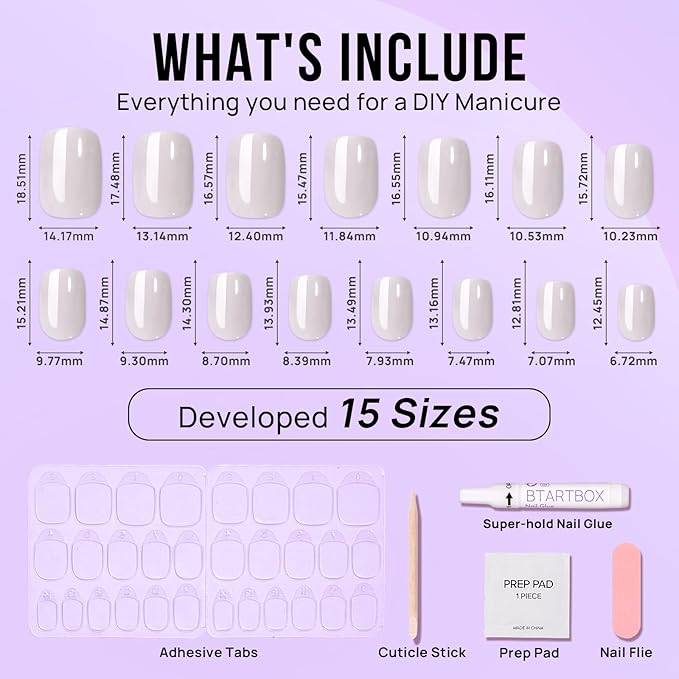 - What's Include:15 nail sizes ensure a totally custom fit, plus we give you everything needed just in case! Each set comes complete with a storage box, nail glue, adhesive tabs, double-sided nail file, cuticle stick, and prep pad.