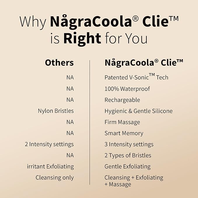 - DEEP CLEANSING: It features an iconic handle design. CLIE 2.0 face cleansing brush equips professional-caliber technology that uses pulsation to cleanse deeply. Featuring sophisticated V-Sonic Tech, NågraCoola face scrubber gently clears pores without harsh abrasion or chemicals, cleansing so effectively that skin care products absorb better. Results includes 6X better cleansing than manual cleansing, reduce appearance of pores, and improve skin tone.