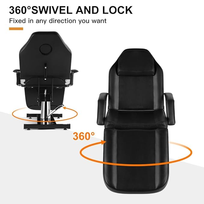 - 【Hydraulic Facial Bed】360° Swivel with locking mechanism provides versatility and flexibility. Foot bar makes height adjustment easier, up to 5 inches. The bed can be easily adjusted to multiple locking positions with a gas-piston release mechanism. Free rotation offers better convenience to estheticians.