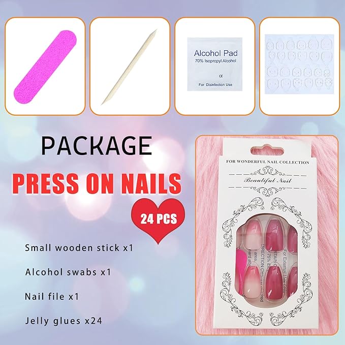 - You Will Get: The package contains 24 pieces of coffin press on nails of different sizes, 1 mini nail file, 1 small wooden stick, and 1 piece of nail glue sticker. (Jelly glue can last about 3 days or more, glue remains longer)