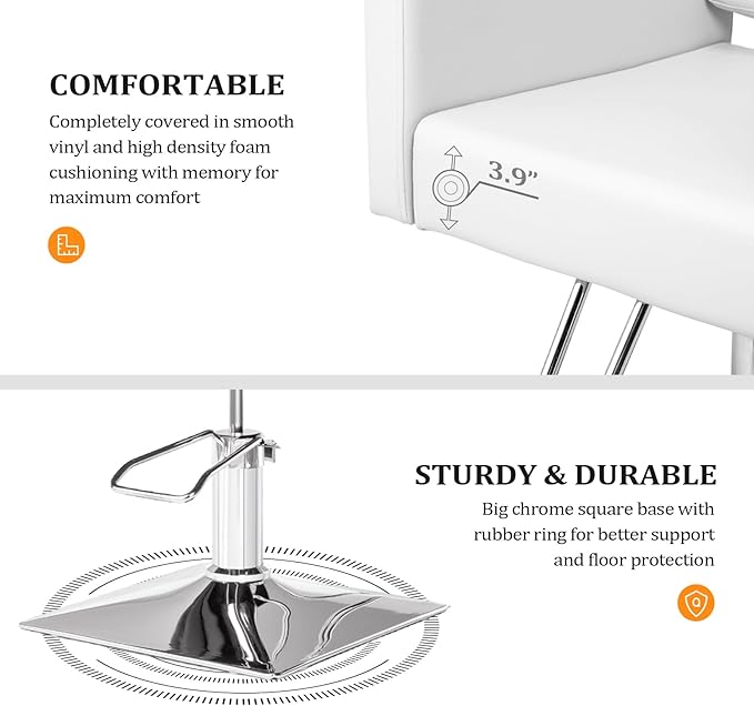 - Sturdy & Durable: Constructed with a heavy-duty hydraulic pump and steel frame, this professional salon chair is more durable than other chairs. With a chrome square base of 19.3 inches, it offers better performance and stability. Aluminium alloy footrest enhances quality and ensures long lasting. Max Weight Capacity: 330 lbs.