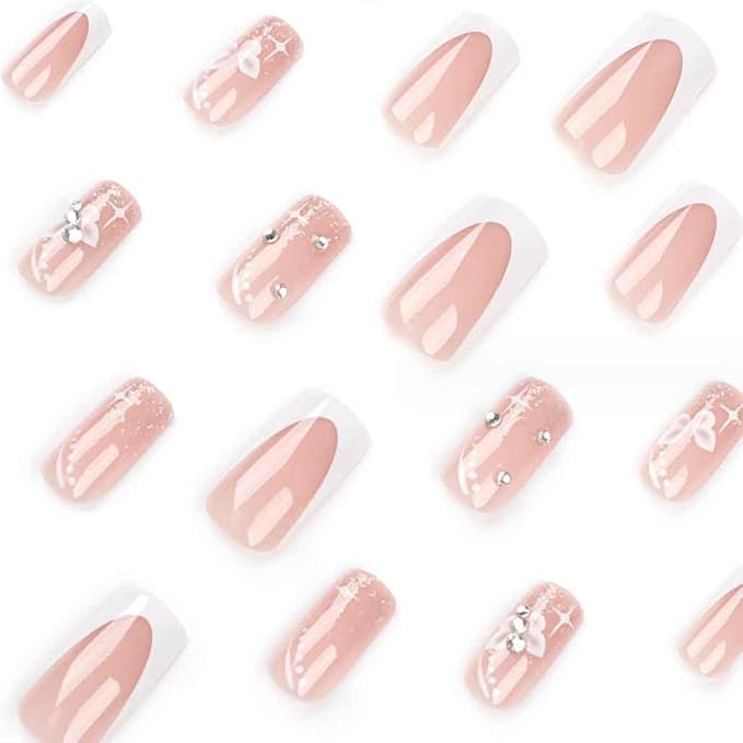 Long Press On Nails - Nude Square Clear Acrylic False Nails - 24PCS French Full Cover Bling Rhinestone Butterfly Design