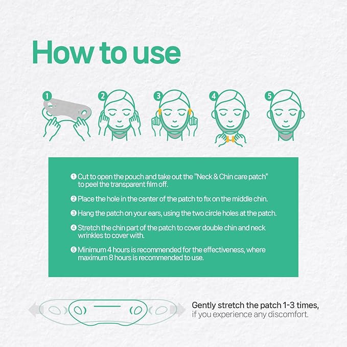 - Easy to Use – 1. Clean and dry your chin and neck area. 2. Remove the protective film. 3. Insert your chin into the hole of the patch. 4. Press the patch gently to ensure it adheres properly to your neck. Wear overnight for best results.