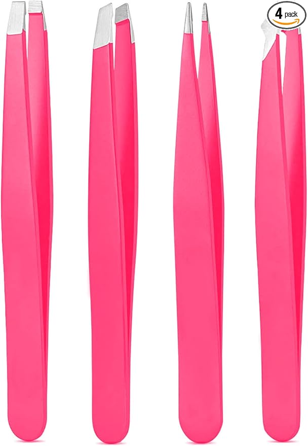 Tweezers Set, High Precision Stainless Steel Eyebrow Tweezers for Facial Hair, Inward Growing Hair and Splinter Remover Kit, Suitable for Women and Men, 4-Piece Set. (pink)