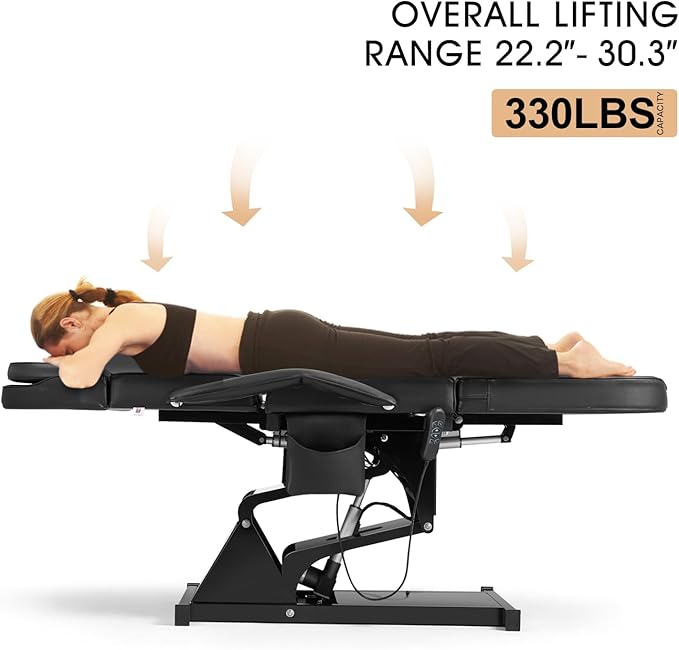 - 【Sturdy and Durable】This massage bed has a sturdy and heavy-duty steel frame that can hold up to 330lbs. Powerful electric hydraulic pumps provide strong support.Non-slip feet ensure its stability and friction, preventing the salon bed from rocking or slipping during massage.