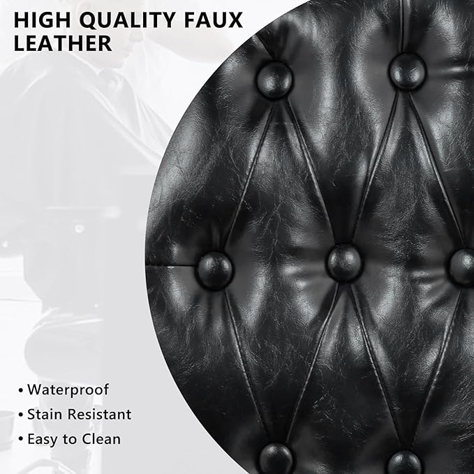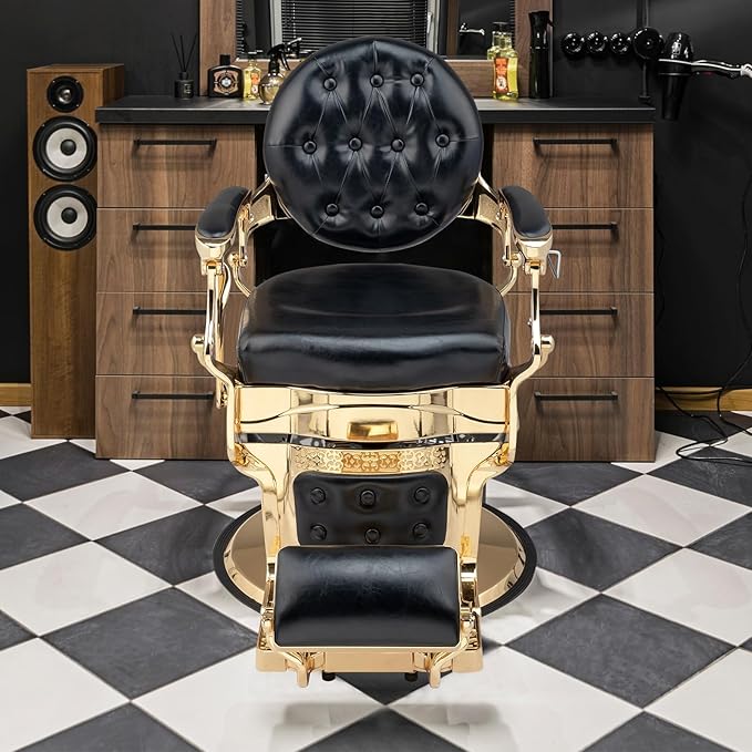 - Vintage Barber Chair : The hydraulic barber chair has a great vintage look that will make a real impression upon your clients. The tufted upholstery, rounded backrest, towel bar, elaborate embossed pattern on footrest and a flip-style footrest are all reminiscent of antique aesthetics.