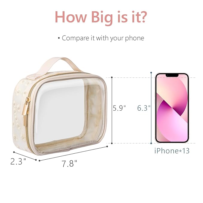 - TSA Approved, Meet Liquids Rule: The medium size clear makeup bag is 7.8 x 2.3 x 5.9 inch, it follows the TSA's 3-1-1 Liquid Rule published by TSA. You can quickly pass the airport security screening. High-quality metal zipper is smooth not get stuck