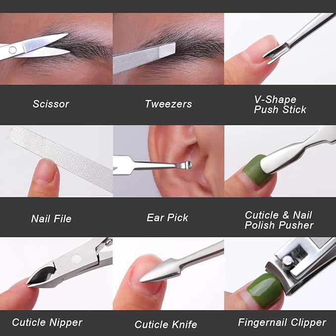 - 【Multi-Functional Manicure Set】 Our manicure kit contains 11 pieces of nail and toenail tools to meet all your hand care, facial, and foot care needs. The nail clipper set suitable for all shape of nails. Manicure set can be a gift for him or her. The best gifts for festivals, such as Christmas, Thanksgiving Day, Fathers' Day and so on.