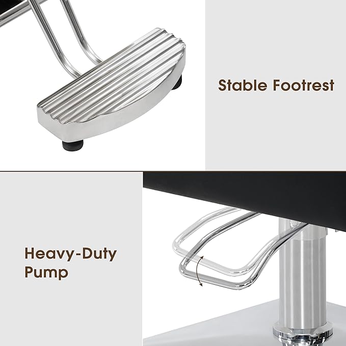 - High Practicability: High-quality hair salon equipment, T-shape footrest for better stability and appearance. 360° Swivel with locking mechanism provides versatility. Ergonomics construction and high density sponge make customer comfortable. Steel and aluminum frame construction. Heavy-duty hydraulic pump with the max supporting weight of 330 lbs.