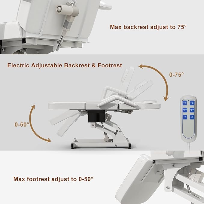 - 【Fully Electric Adjustable】3 motor power free your hands and start smart work. Our electric facial bed can be independently adjusted in angle and height with a remote control. The main motor lift mechanism offers height adjustment, ranging from 20.9'' to 27.6" to suit different tasks. With backrest goes up 75°, and footrest goes down 50°, tattoo bed could be converted to tattoo chair to guarantee its multi-function and optimal convenience for estheticians.