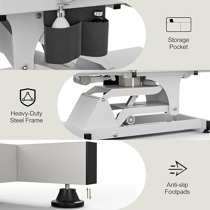 - 【Solid Constuction】 Constructed of heavy duty steel frame, our electric lash beds working load up to 200kg/440lbs and meet the needs of the majority. 3 powerful electric motor on the bottom makes the facial table more stable and strong, which could ensure years of reliable use. The anti-slip foot pads ensure its stability and friction, preventing the tattoo bed from rocking or slipping during massage. NOTE: pls don't just sit on the backrest or footrest.