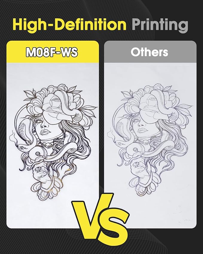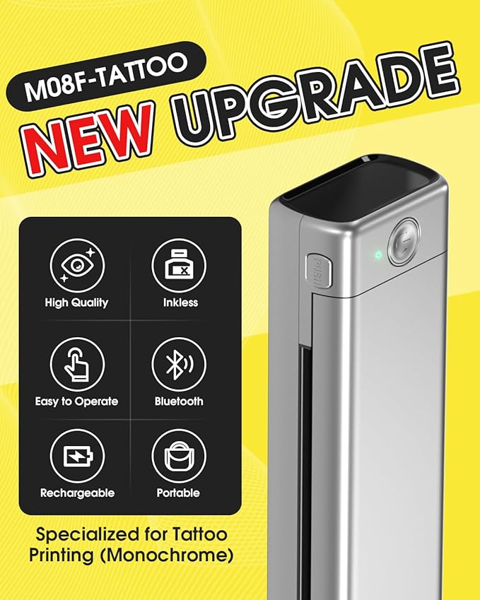 - √ Tattoo Version of Phomemo M08F Portable Printer: Phomemo team has developed printers for tattoo stencil printing that utilize advanced thermal technology to produce high-definition, precise patterns and lines. No ink required, no need to deal with clogging or cleaning issues. (Note: This tattoo printer is specifically designed to print simple and one-color patterns).