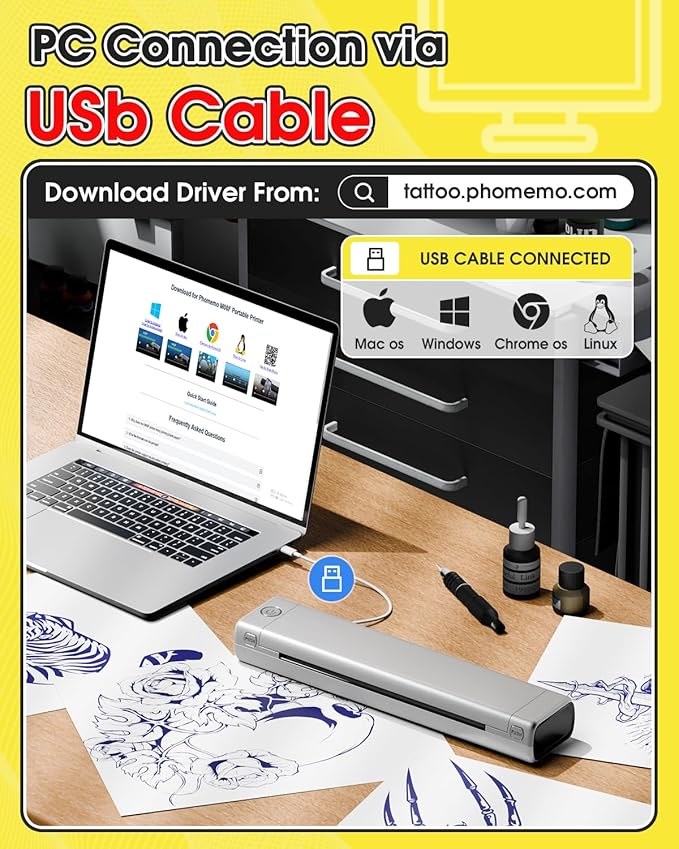 - √ Strong Compatibility: Phomemo M08F portable tattoo printer is compatible with a variety of devices such as smartphones, tablets, laptops, and desktop computers, making design and printing tasks for tattoo artists easier than ever before. It supports multiple operating systems including Android, iOS, Windows, MacOS, and ChromeOS.