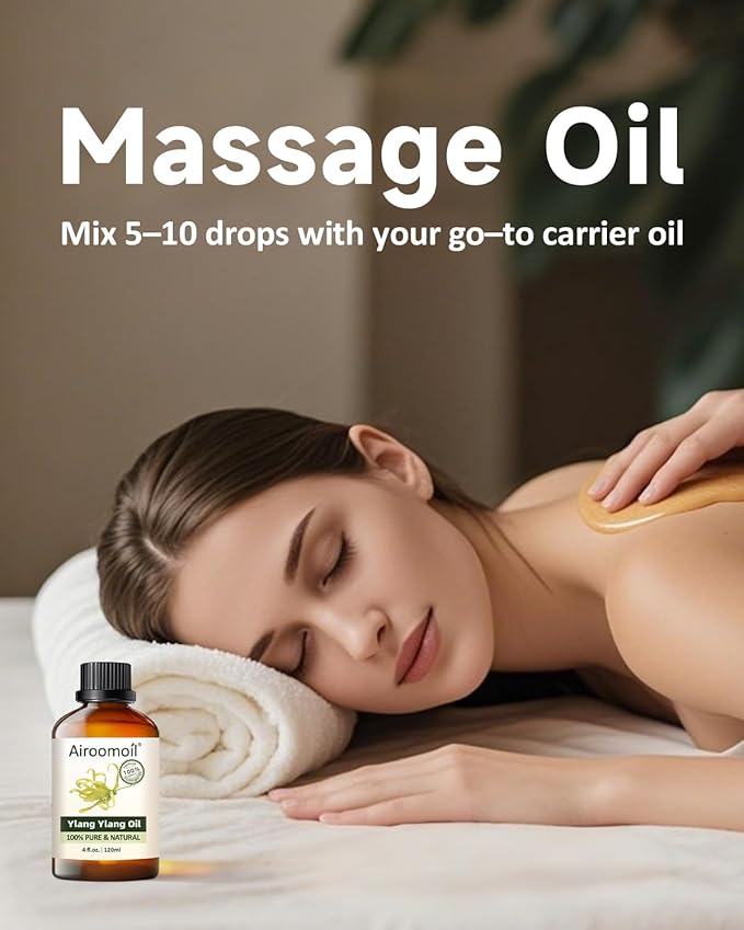 - Body Massage & Safety: Dilute 1 drop ylang ylang oil with 10-20 drops carrier oil (coconut, jojoba). Massage onto skin in circular motions for sensual relaxation. Airoomoil ylang ylang essential oil is 100% natural, vegan, and cruelty-free. A local skin test must be conducted before use