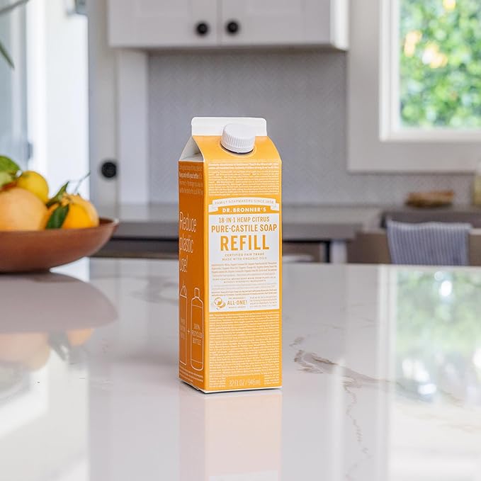 Dr. Bronner's Pure-Castile Magic Soap Liquid, Citrus, Made with Organic Oils for Body, Face, Hair, Dishes, Laundry Vegan, Natural, Non-GMO, Biodegradable, 18-in-1 Multi-Use - Citrus, 32oz + Refill