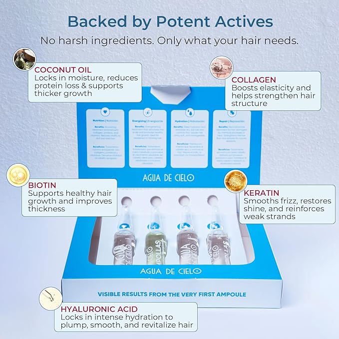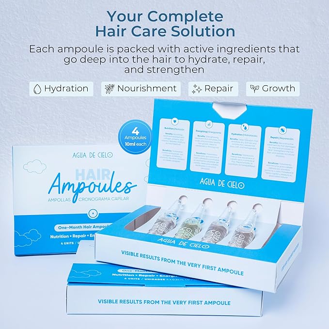 Agua de Cielo Hair Ampoules Set - Intensive Hair Treatment for Damaged Hair, Nourish, Hydrate, Repair & Energize Hair - 4 Ampoules of 10ml
