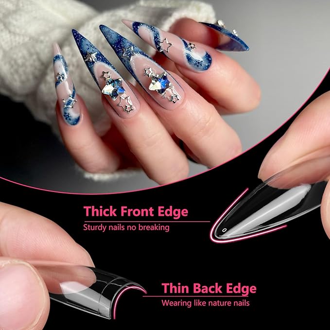 - 【Wide Application & Perfect Gift】XL nail tips stiletto are great for both DIY nail art at home and nails salons. Long stiletto fake nail tips can also be a wonderful gifts choice to your wife, girlfriend, mother or sisters on Birthday, Christmas, Parties, Valentine's Day, Dating and Wedding etc.