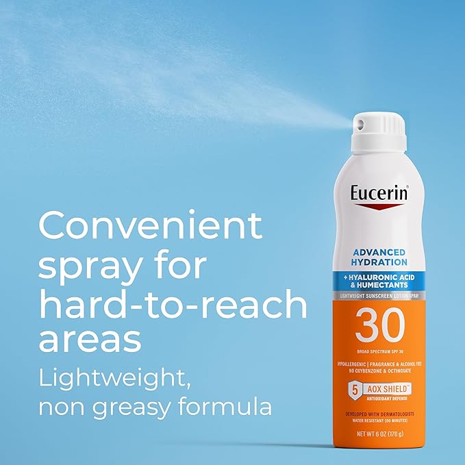 Eucerin Advanced Hydration SPF 30 Sunscreen Spray, Lightweight Spray Sunscreen with Hyaluronic Acid and Humectants, Hypoallergenic, Fragrance and Alcohol Free, 6 Oz Bottle