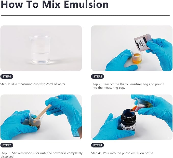 - Photo Emulsion Kit: Includes a bottle of approximately 8.5 ounces of photo emulsion, 1g diazo sensitizer, a 50ml measuring cup, 1 pair of gloves, 5 wooden stir sticks, and an instruction. Suitable for various exposure devices, it is recommended to use UV LED light. Note: It needs to be done in a darkroom