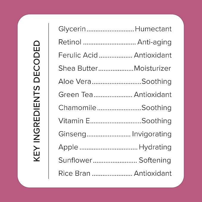 - Active Ingredients : Hyaluronic Acid, Retinol, Vitamin E, hyaluronic_acid