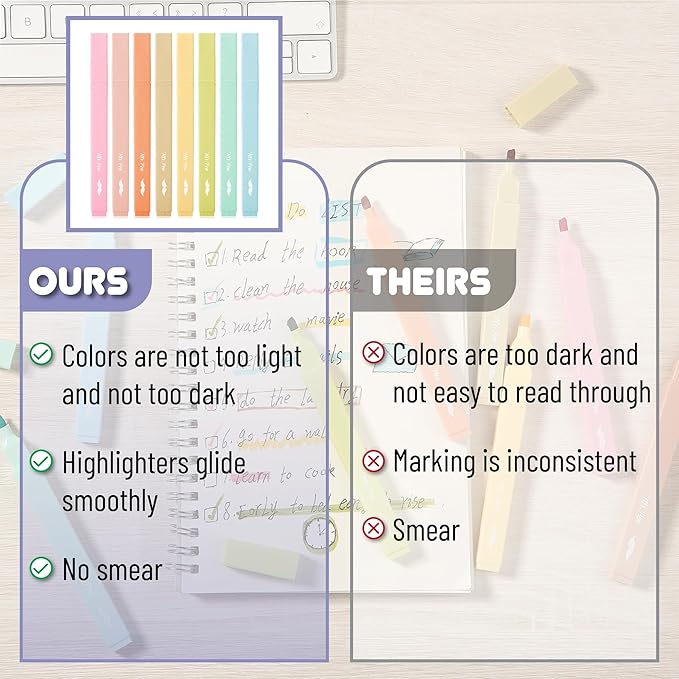 - Make your notes and papers pop with our soft and gentle highlighters! This package includes 8 highlighters in non-neon, assorted colors. Our highlighters are perfect for making your work and school life a little bit brighter.