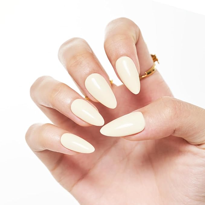 WOOYAS Press on Nails Medium - Creme Light Yellow Almond Fake Nails Solid Color Glossy False Fingernails in 15 Sizes, Long Stick on Nails for Women - 24Pcs