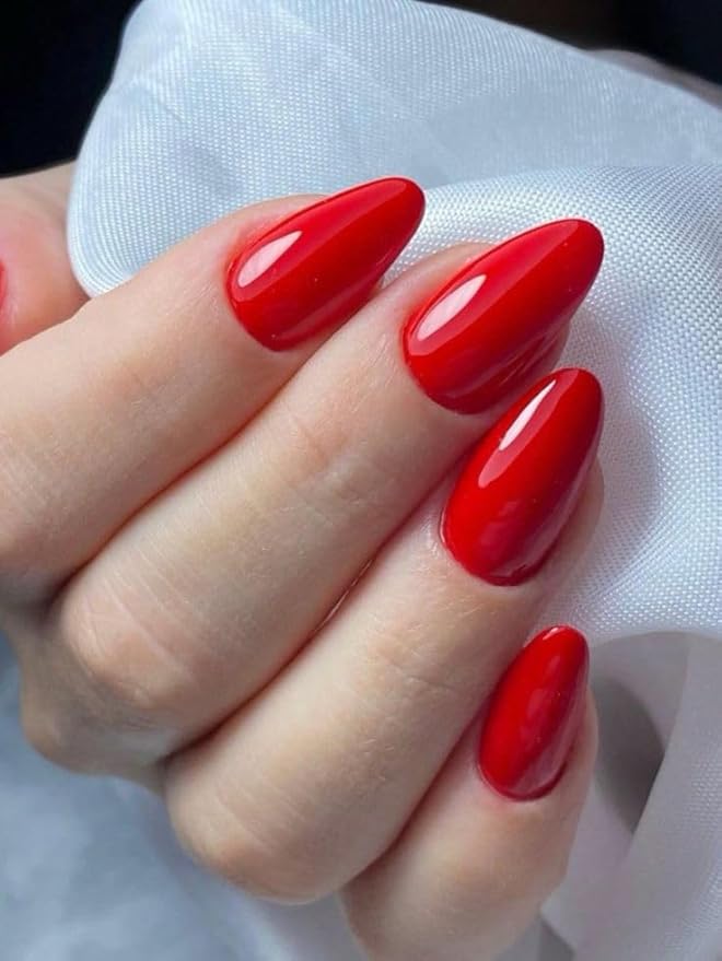 Wooyas Red Press on Nails Almond,Handmade Stiletto Glossy False Nails Reusable Salon Perfect Stick on Nails 24 Pcs Soft Gel Glue On Nails Kit for Women Gift