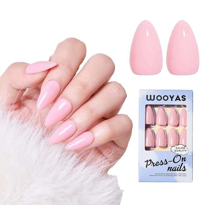 Wooyas Press on Nails Almond, Soft Pink Medium Handmade Gel Fake Nails Reusable ,Lightweight Natural Glossy Fake Nail in 12 Sizes - 24 Pcs Soft Gel Glue On Nails Kit for Women Gift