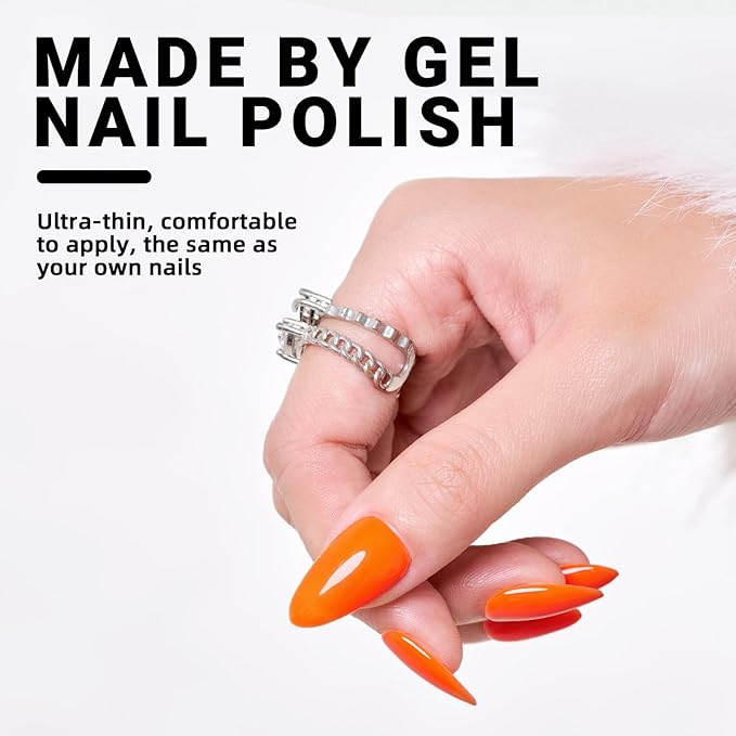 Wooyas Jelly Orange Press on Nails Almond, Hot Orange Medium Glossy Handmade Gel Fake Nails, Neon Reusable Salon Perfect Glue on Nails in 12 Sizes - 24 Pcs Soft Gel Glue On Nails Kit for Women Girls