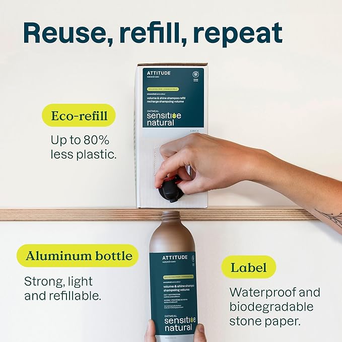 ATTITUDE Volume and Shine Hair Shampoo for Sensitive Dry Scalp, EWG Verified, Soothing Oat, Thin Hair, Naturally Derived Ingredients, Vegan Plant-Based, Unscented, Refillable Aluminum Bottle, 16 Fl Oz