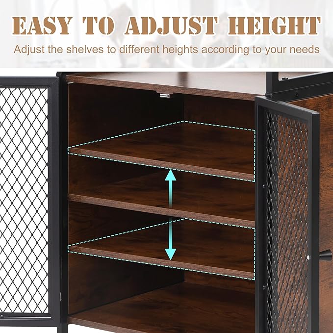 - 【Industrial Style Salon Station】: Featuring rustic brown surfaces with charming wood grain and black iron sides, this rustic freestanding shelf and cabinet for hair stylists is ideal for barber shops, beauty salons, spas, etc.