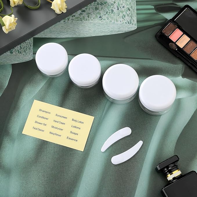 - Useful Travel Accessories: This is a nice assortment of travel containers in a useful zip case. ( Come in 4 Travel Bottles+4 Travel Jars+2 Spray Bottles+2 Scoopers+1 Funnel+1 Clean Brush + 1 Page Label + 1 Clear Toiletry Bag ) Multiple ones allow you take along different beauty products and toiletries according to your requirement